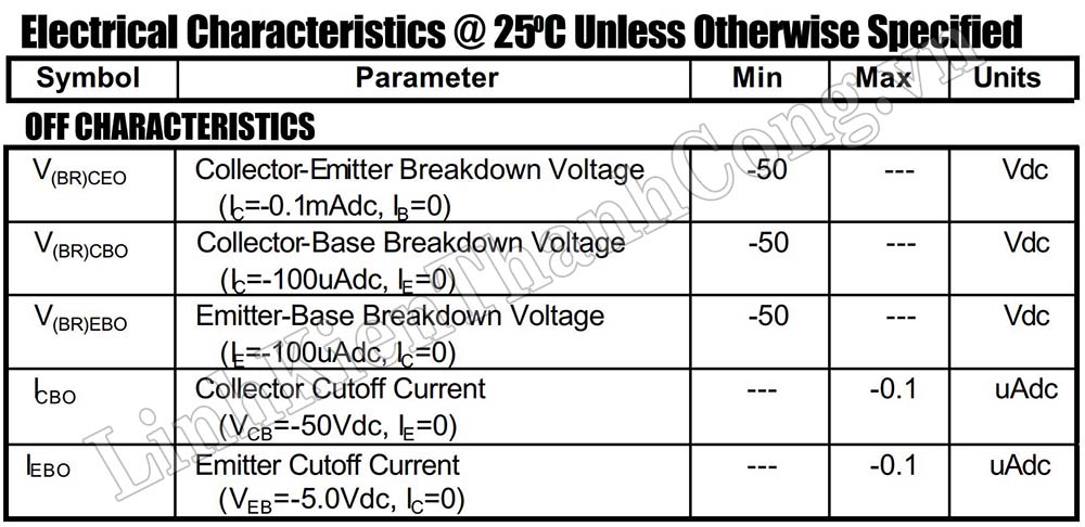 - Điện áp cao nhất giữa 2 chân C và E của Transistor: 50V