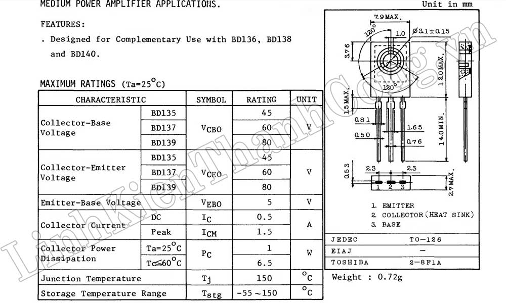 - Dòng điện cực đại: IC = 1.5A