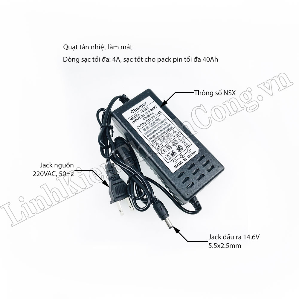 - Đầu ra sản phẩm là Jack 5.5x2.5mm với điện áp 14.5VDC dòng điện 4A, sạc cho Pack pin tối đa 40Ah