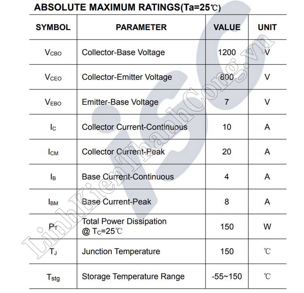 - Dòng điện cực đại: IC = 10A