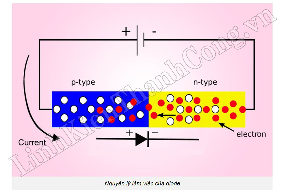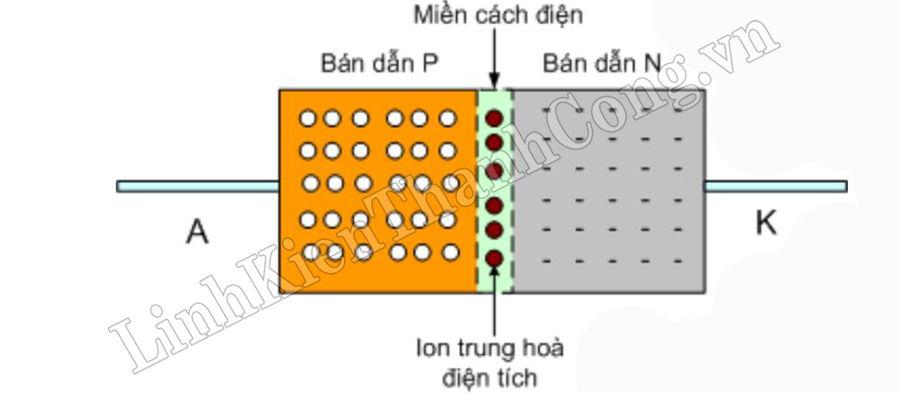 - Khối bán dẫn P chứa nhiều lỗ trống tự do mang điện tích dương nên khi ghép với khối bán dẫn N thì các lỗ trống này có xu hướng chuyễn động khuếch tán sang khối N. Cùng lúc khối P lại nhận thêm các điện tử (điện tích âm) từ khối N chuyển sang. Kết quả là khối P tích điện âm (thiếu hụt lỗ trống và dư thừa điện tử) trong khi khối N tích điện dương (thiếu hụt điện tử và dư thừa lỗ trống).