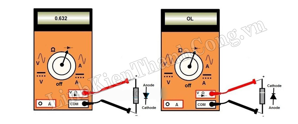 + Trường hợp 1: Đặt que đen vào chân Anode, que đỏ vào chân Cathode => Kim lên. Sau đó chúng ta đảo ngược que đo vào 2 chân Diode. Tức là que đen lúc này đặt vào chân Cathode, que đỏ vào chân Anode. Kim không nhảy. Kết luận diode vẫn còn hoạt động tốt.