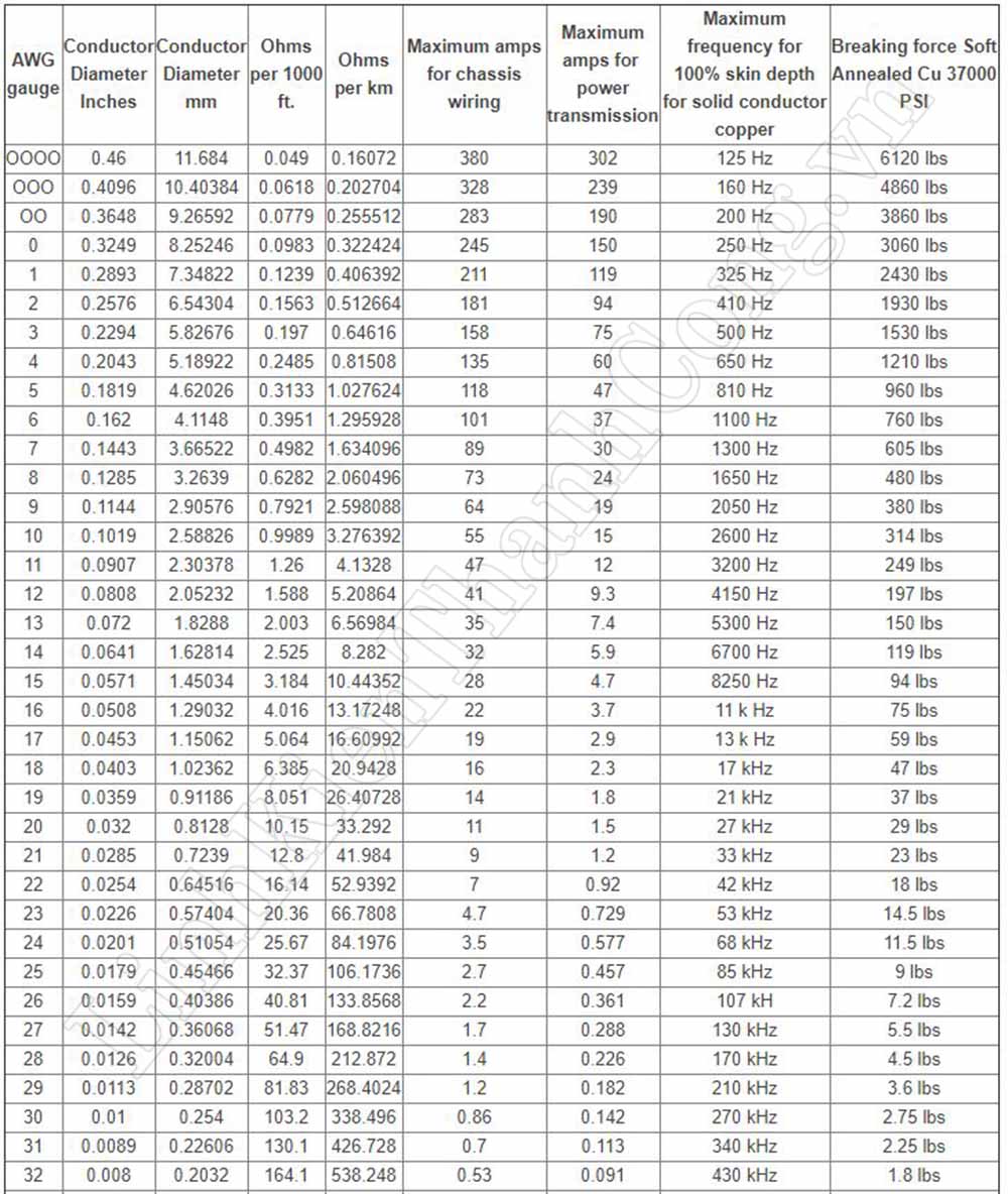 - Thông số cơ bản một số cáp theo American Wire Gauge