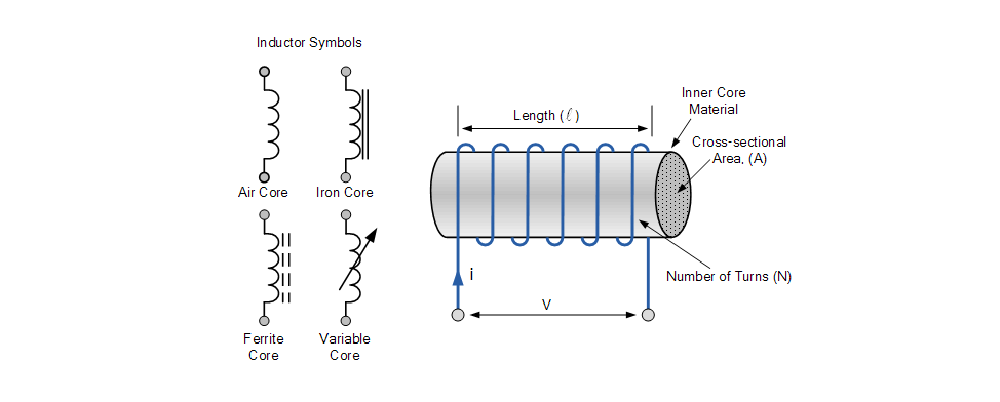 - Một cuộn dây có một vùng lõi trung tâm, ( A ) với số vòng dây không đổi trên một đơn vị chiều dài, ( l ). Vì vậy, nếu một cuộn dây N được liên kết bởi một lượng từ thông, Φ thì cuộn dây có liên kết từ thông N và bất kỳ dòng điện nào, ( i ) chảy qua cuộn dây sẽ tạo ra một từ thông cảm ứng theo hướng ngược lại với dòng chảy. Sau đó, theo Định luật Faraday, bất kỳ thay đổi nào trong liên kết từ thông này sẽ tạo ra điện áp tự cảm ứng trong cuộn dây đơn: