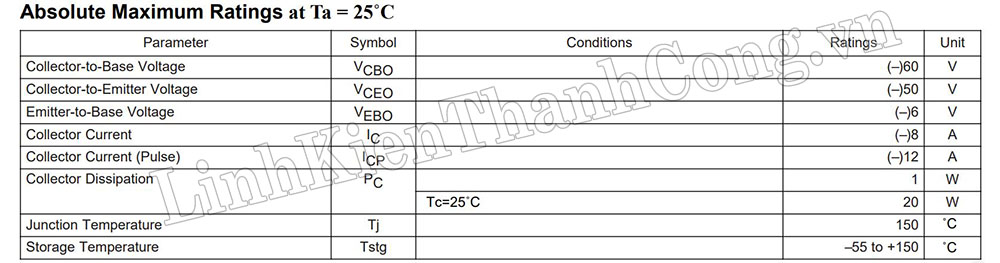 - Dòng điện cực đại: IC = 8A