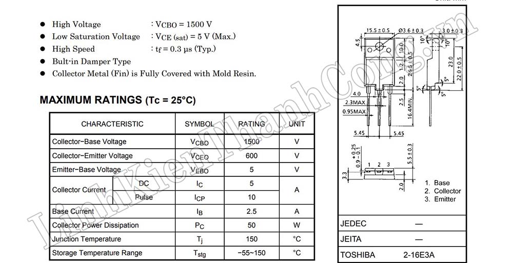 - Dòng điện cực đại: IC = 5A