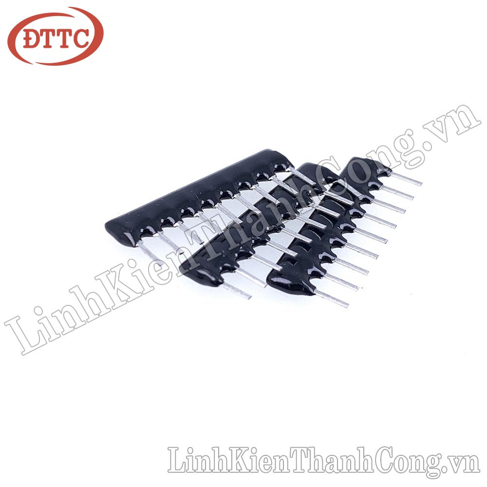 - Điện trở băng 1K Ohm 9 chân là một mạng điện trở, gồm 9 điện trở có cùng giá trị 1K Ohm được kết nối với nhau. Điện trở băng 1K Ohm có một chân chung, các chân còn lại nối với chân chung qua 1 điện trở, giá trị điện trở đó thường được ghi trên thân.