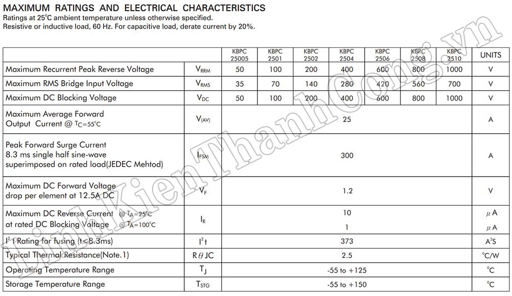 - KBPC2510 Diode là linh kiện dùng để chỉnh lưu dòng điện xoay chiều AC thành DC.