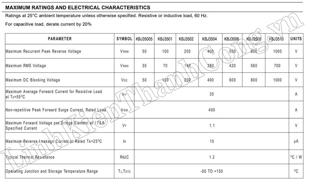 - DIODE CẦU KBJ3510 là linh kiện dùng để chỉnh lưu dòng điện xoay chiều AC thành DC.
