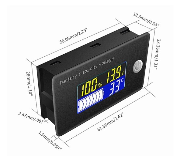 - Chức năng: Đo, hiển thị mức điện áp, dung lượng pin, acquy và nhiệt độ ( nhiệt độ hiển thị độ C và độ F có thể điều chỉnh)