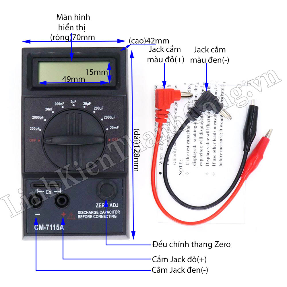 - Dải đo điện dung tụ: 200pF - 20uF (sai số 0.5%)