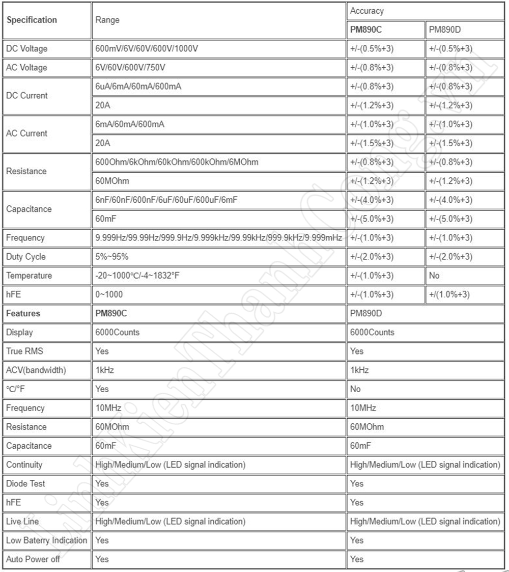 - Đồng Hồ Vạn Năng PM890 là thiết bị đo chuyên dụng với các chức năng chính là đo điện trở,đo điện áp DC, AC, đo dòng, xác định tần số... Ngoài những chức năng chính của 1 chiếc đồng hồ vạn năng, PM890C còn có chức năng phát hiện khu vực điện áp không tiếp xúc bằng cảm ứng.