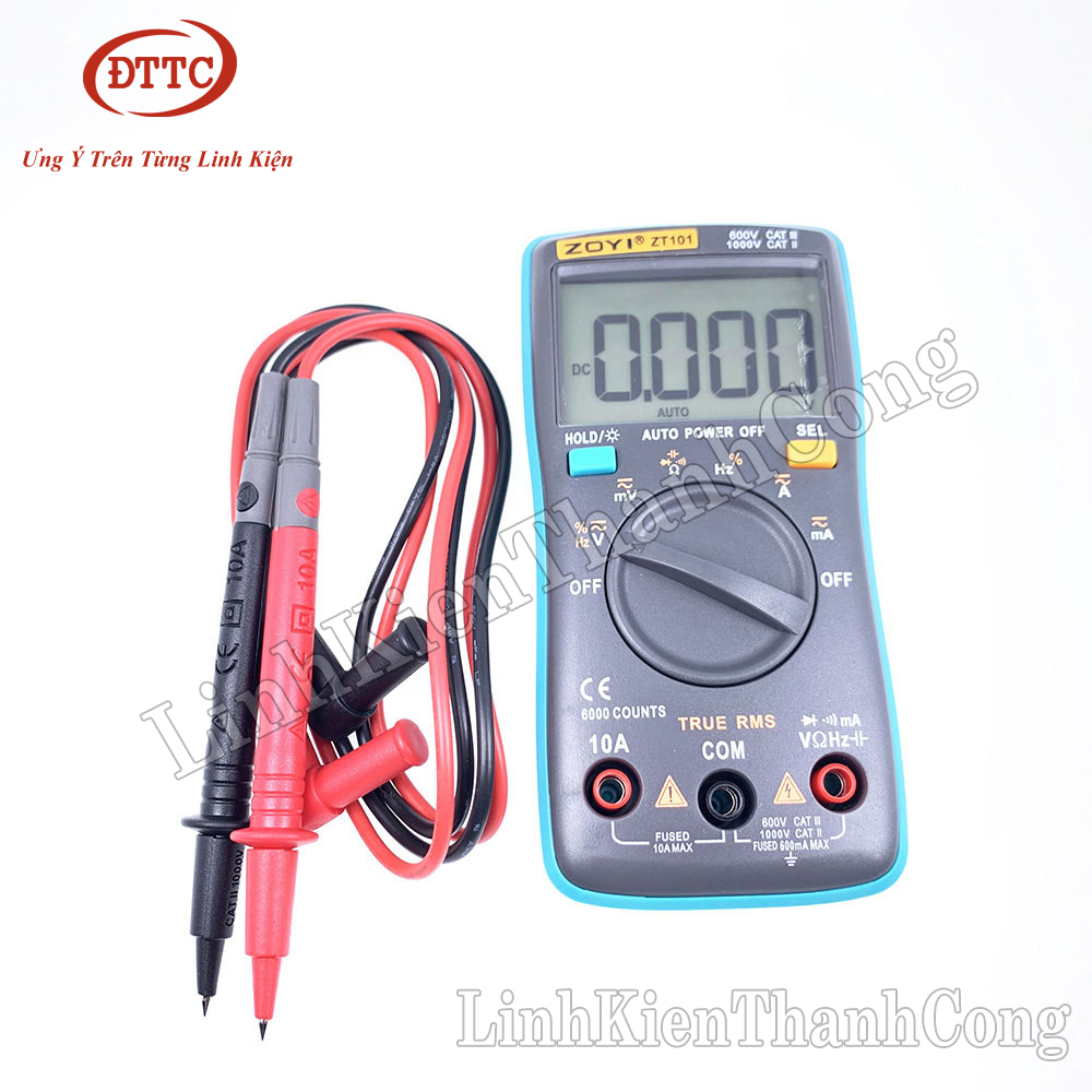 - Đồng hồ ZT101 là mẫu đồng hồ vạn năng sử dụng màn hình hiển thị là màn LCD có kích thước nhỏ gọn, tiện lợi cho việc đo và kiểm tra tần số, tụ điện, điện trở, điện áp AC, DC,... ngoài ra còn hỗ trợ đo giá trị TRUE RMS.