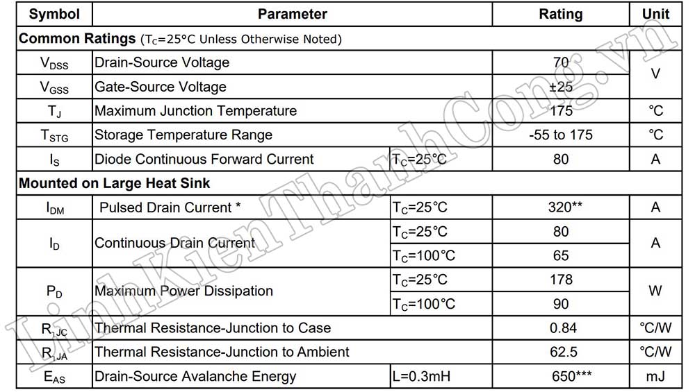 - Điện áp VGS: ± 25V