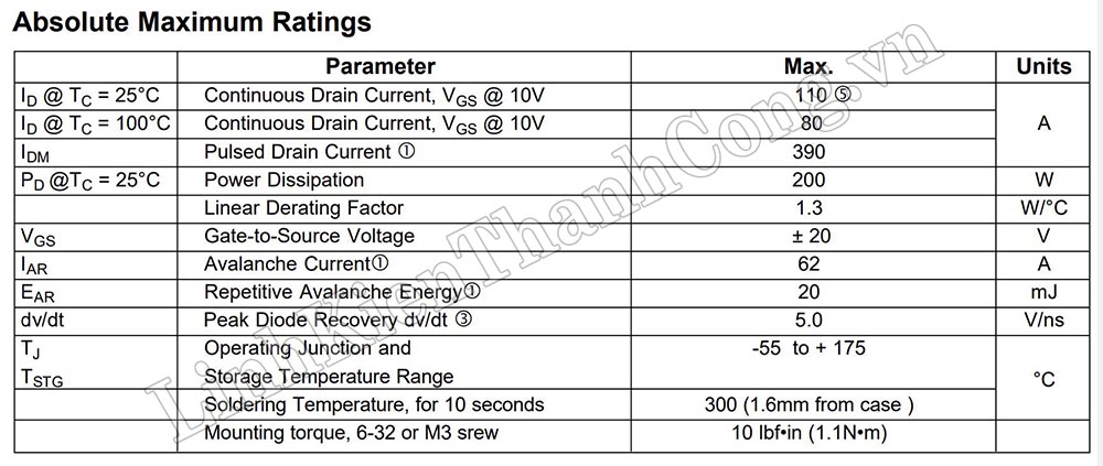 - Điện áp VGS: ± 20V