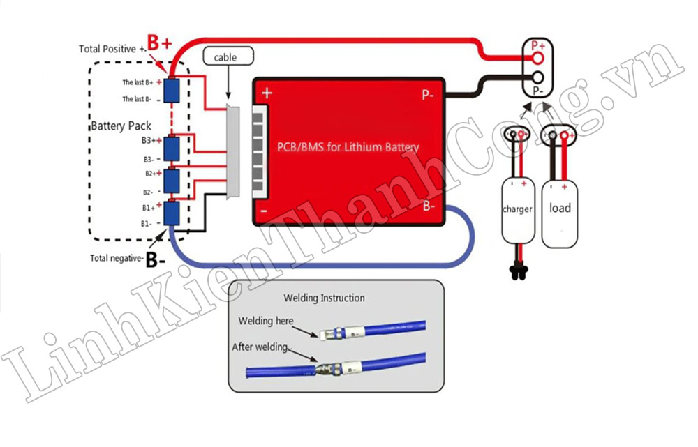 - Kết nối các Cell pin như hình vẽ bên dưới (Lưu ý dây đen kết nối với cực âm Cell pin và kết nối với B-)