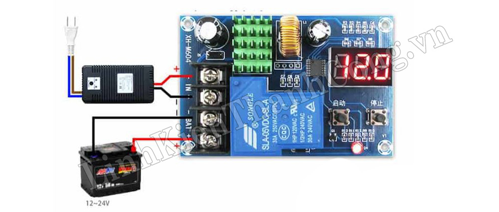 - Mạch XH-M604 được sử dụng để quản lý tự động việc đóng ngắt điện sạc cho Acquy. Mạch được tích hợp chip điều khiển điện áp sạc cho Ắc Quy với 2 nút nhấn điều chỉnh điện áp sạc và điện áp ngắt.