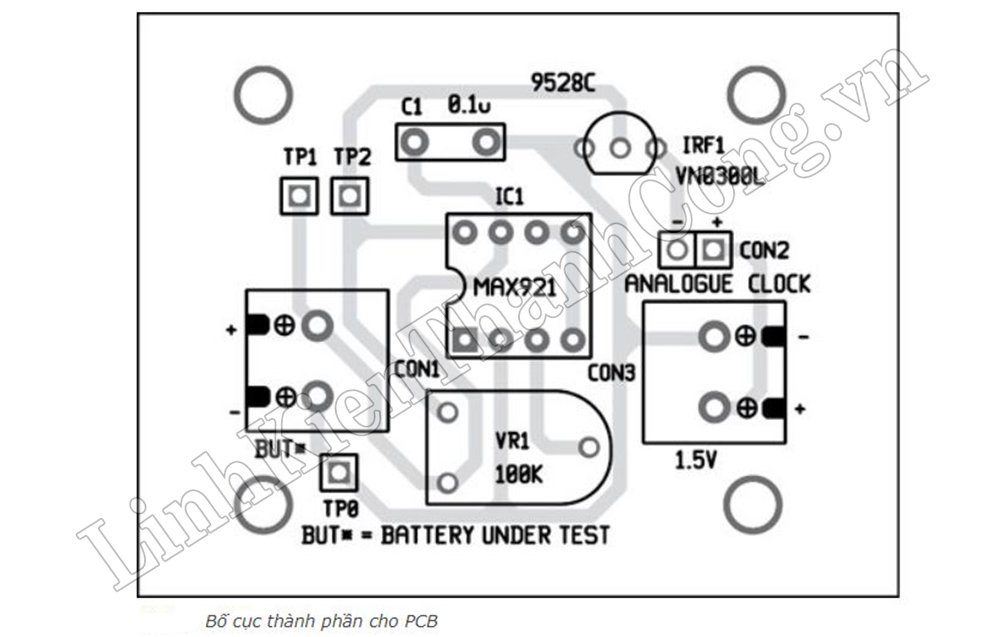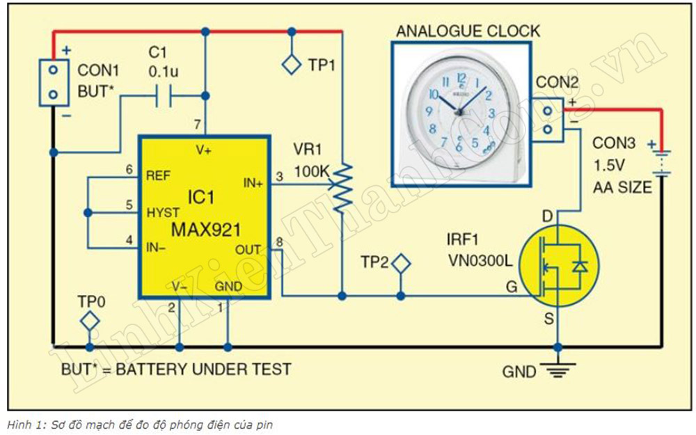 - IC1 giám sát tuổi thọ của BUT (pin đang được kiểm tra) và kiểm soát việc cung cấp năng lượng cho đồng hồ kim. Khi điện áp BUT (PIN) giảm xuống dưới giá trị ngưỡng do VR1 đặt, đầu ra của IC1 sẽ trở nên thấp, điều này dẫn đến việc ngắt MOSFET IRF1. Điều này có nghĩa là, nguồn điện cung cấp cho đồng hồ kim bị ngắt và do đó đồng hồ ngừng chạy. Việc đọc thời gian trên đồng hồ tại thời điểm này cho biết thời gian phóng điện của PIN (TH bạn đặt thời điển ban đầu ứng với 12:00 hay 00:00). Mạch có thể kiểm tra PIN có điện áp từ 2,5 ~ 11V.
