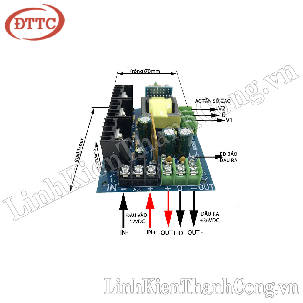- Mạch nguồn đối xứng 12VDC là sản phẩm chuyên dùng để cung cấp đầu ra đối xứng +36V hay -36V cho các sản phẩm điện tử như âm ly, loa,...