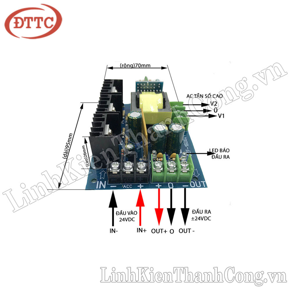 - Mạch nguồn đối xứng 24VDC là sản phẩm chuyên dùng để cung cấp đầu ra đối xứng +24V hay -24V cho các sản phẩm điện tử như âm ly, loa,...