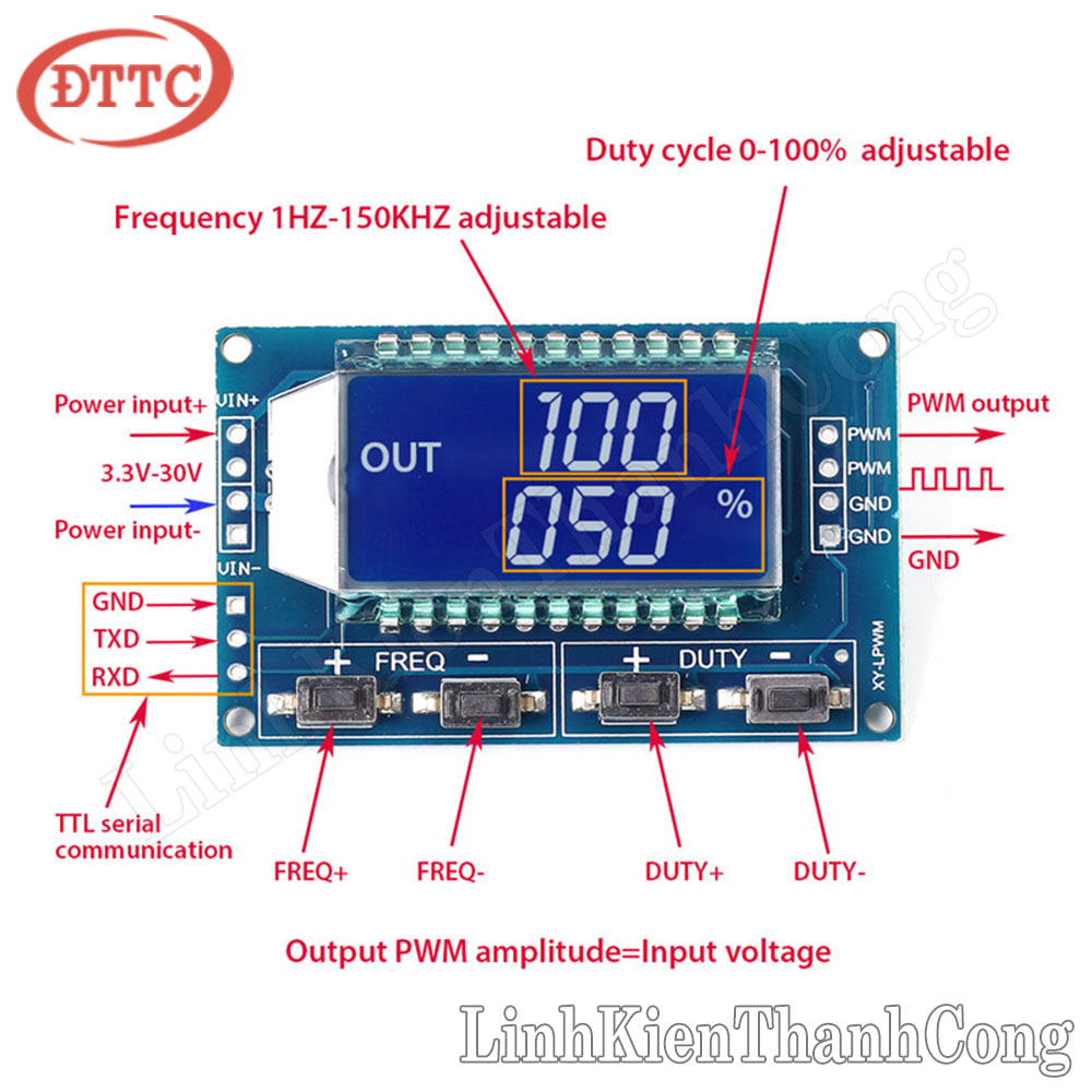 - Mạch phát xung vuông 1Hz-150Khz XY-LPWM sử dụng phát xung vuông từ 1 - 150KHZ, phục vụ cho thí nghiệm, DIY, trong các sản phẩm điện tử,...
