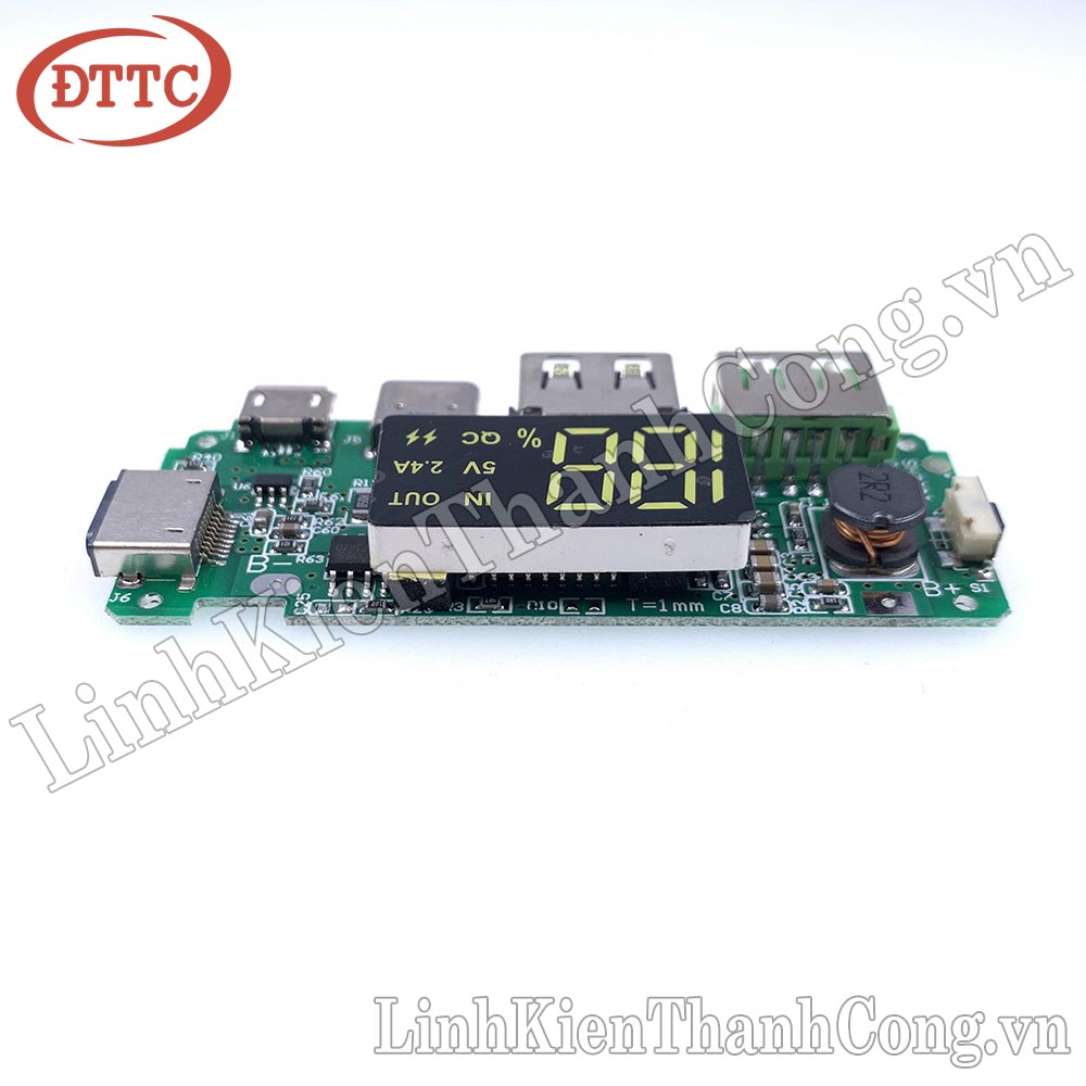 - Mạch Sạc Dự Phòng USB 5V 2.4A Có Màn Hình với đầu vào là 3 cổng sạc thông dụng: TypeC, MicroUSB, Lightning có hỗ trợ sạc nhanh QC. Đầu ra gồm 2 cổng USB 5V 2.4A đặc biệt có 1 cổng ra hỗ trợ sạc nhanh QC. Màn hình hiển thị % Pin và chỉ thị sạc rõ ràng.