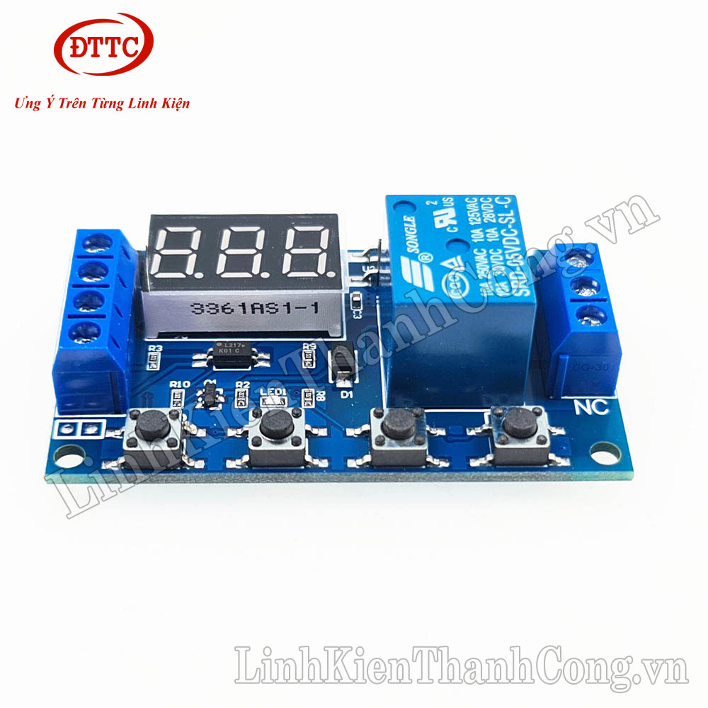 - Mạch tạo trễ theo chu kỳ đóng ngắt relay 0 giây - 999 phút được sử dụng đơn giản với 4 phím bấm chức năng và đường tín hiệu kích: