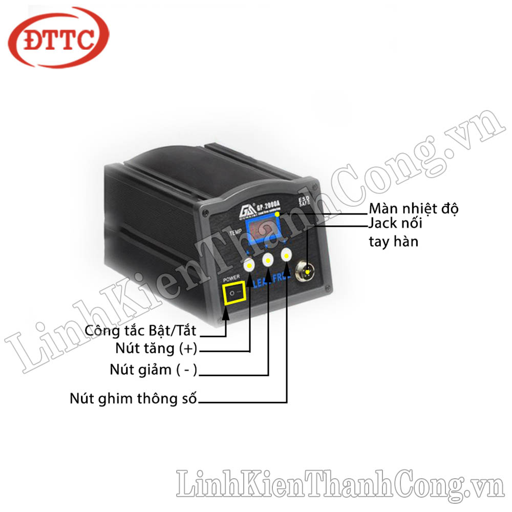 - Nhiệt độ đầu ra tối đa: 450°C, nhiệt độ điều chỉnh qua nút nhấn trên thân bộ nguồn.