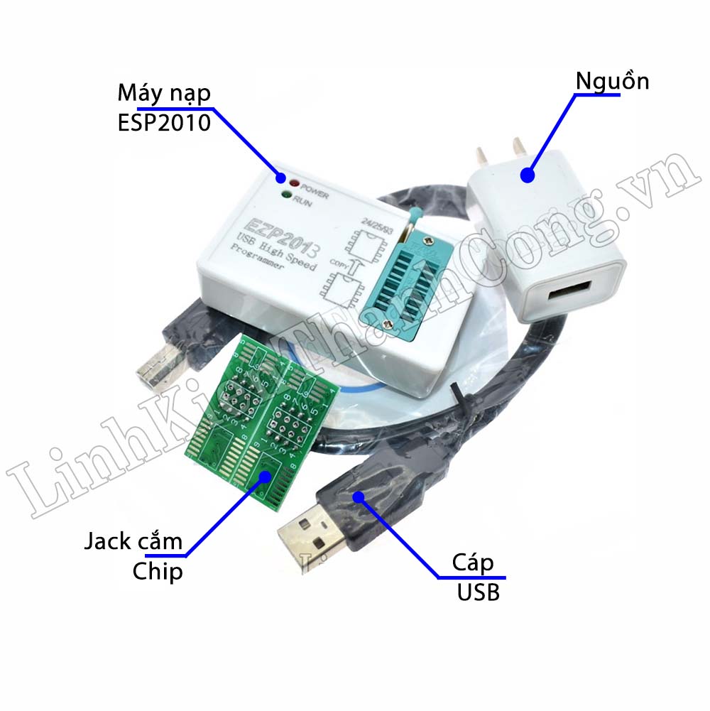 - Gồm: 1 máy nạp EZP2013 + 1 cáp USB + 1 Nguồn + 2 Jack cắm cho chip
