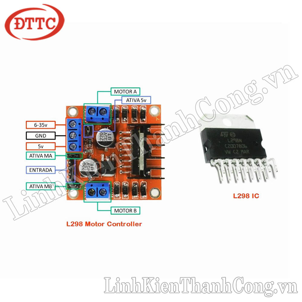 + Có gắn tản nhiệt chống nóng cho IC, giúp IC có thể điều khiển với dòng đỉnh đạt 2A và IC L298N được gắn với các đi ốt trên board giúp bảo vệ vi xử lý chống lại các dòng điện cảm ứng từ việc khởi động/ tắt động cơ.