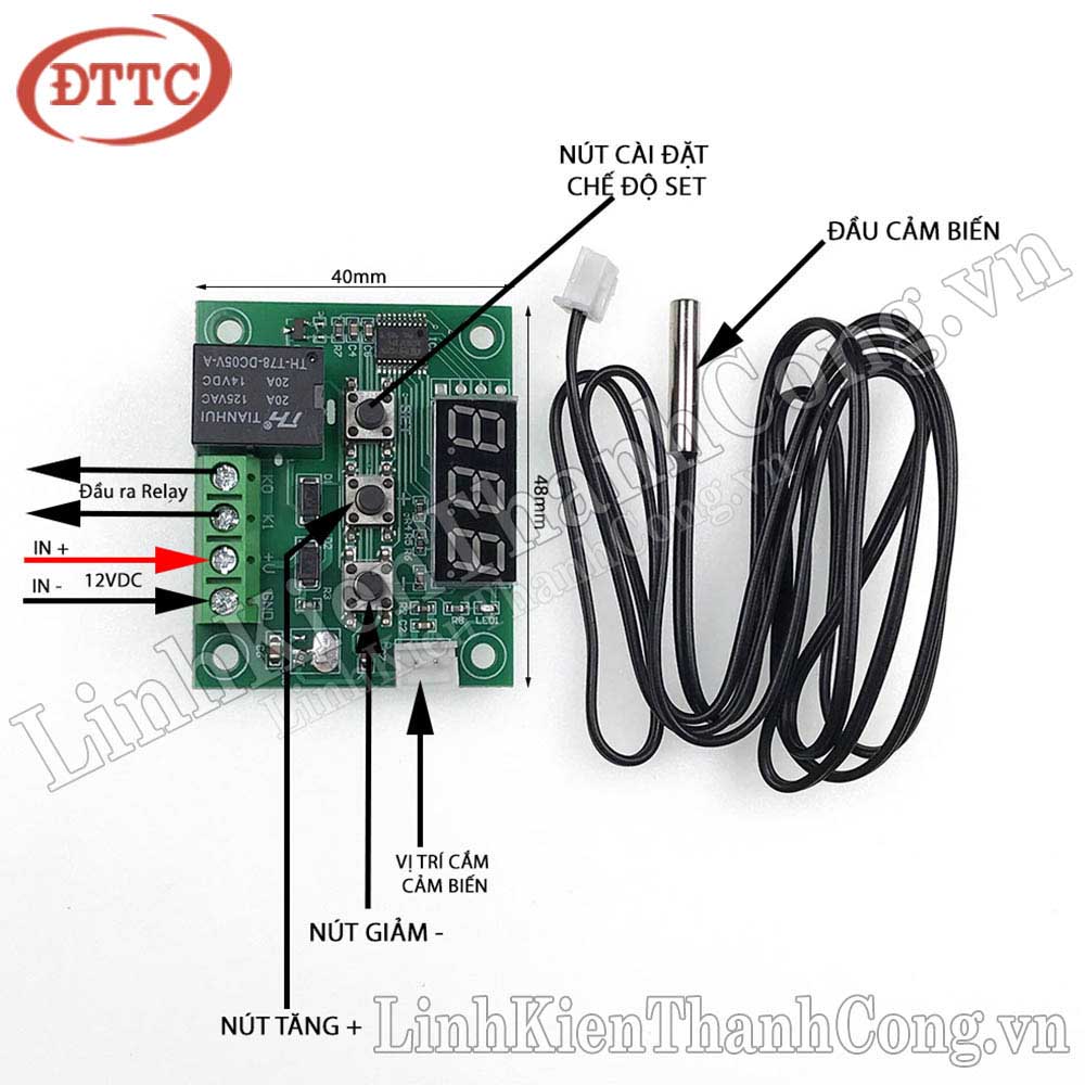 - Đây là module cảm biến nhiệt độ điều khiển 1 relay dạng thường mở và có hiển thị qua LED 7 đoạn.