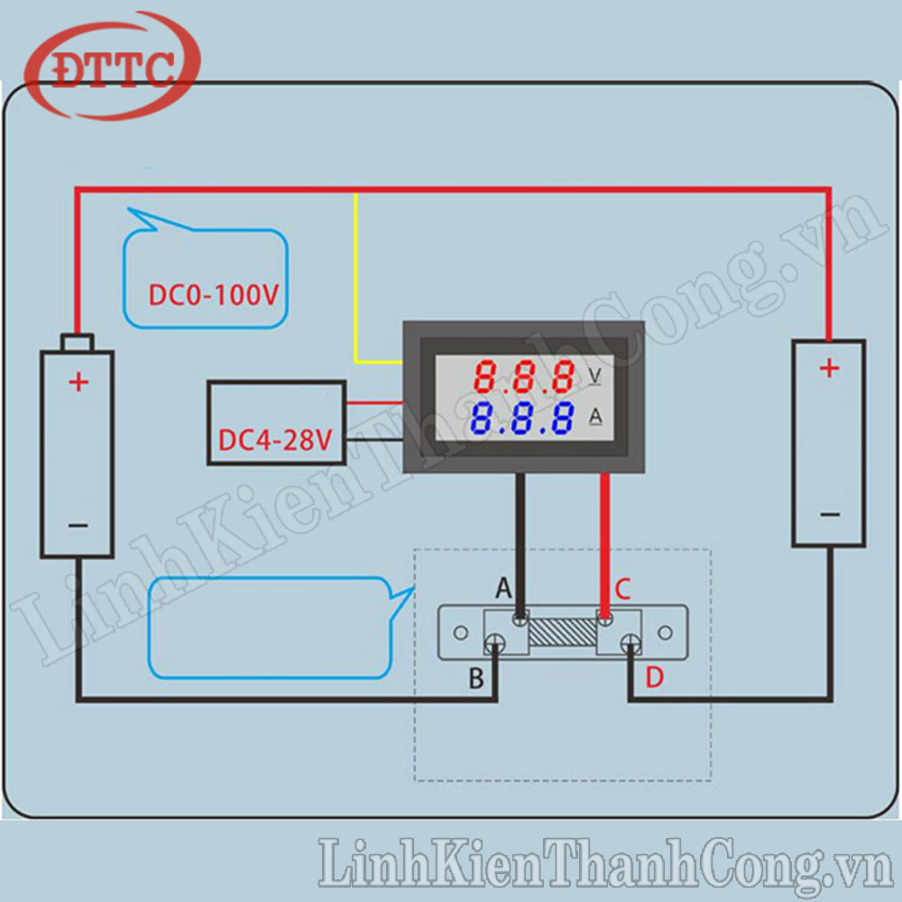 - Module đo dòng điện, điện áp DC được sử dụng để đo và hiển thị điện áp, dòng điện của tải DC tối đa 100A/100VDC, đồng hồ có trở shunt tích hợp, thiết kế nhỏ gọn, bền bỉ, kết nối dễ dàng, có thể chỉnh sai số của sản phẩm bằng hai biến trở căn chỉnh áp và dòng với thiết bị đo chuẩn.