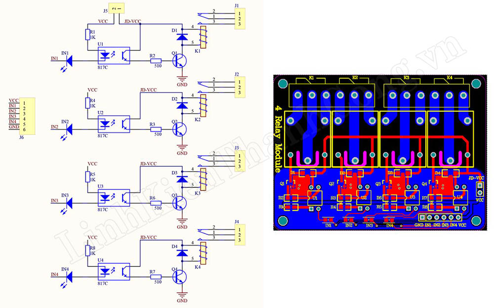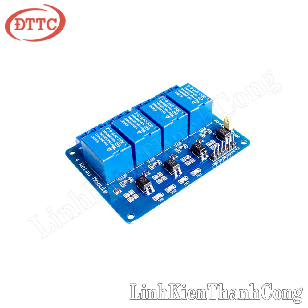 - Module Relay 4 kênh 5V dùng dòng điện nhỏ của vi điều khiển, arduino, PLC, esp8266,... để điều khiển các thiết bị điện, đồ dùng điện hoạt động ở mức điên áp cao như điện sinh hoạt, hay trong các ứng dụng thiết bị thông minh.