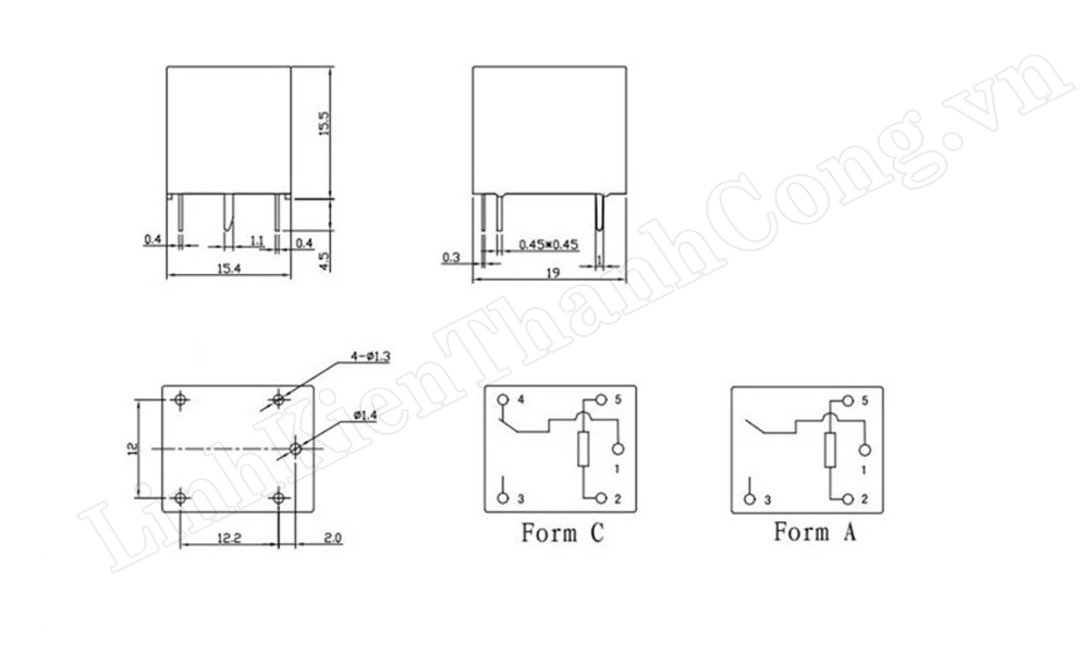 - Relay có 5 chân, trong đó 2 chân cuộn dây 2 - 5 dùng để kích Relay, 3 chân còn lại chia ra 2 cặp, một cặp tiếp điểm thường đóng lằ cặp 1 - 4, một cặp tiếp điểm thường mở là cặp 1 - 3