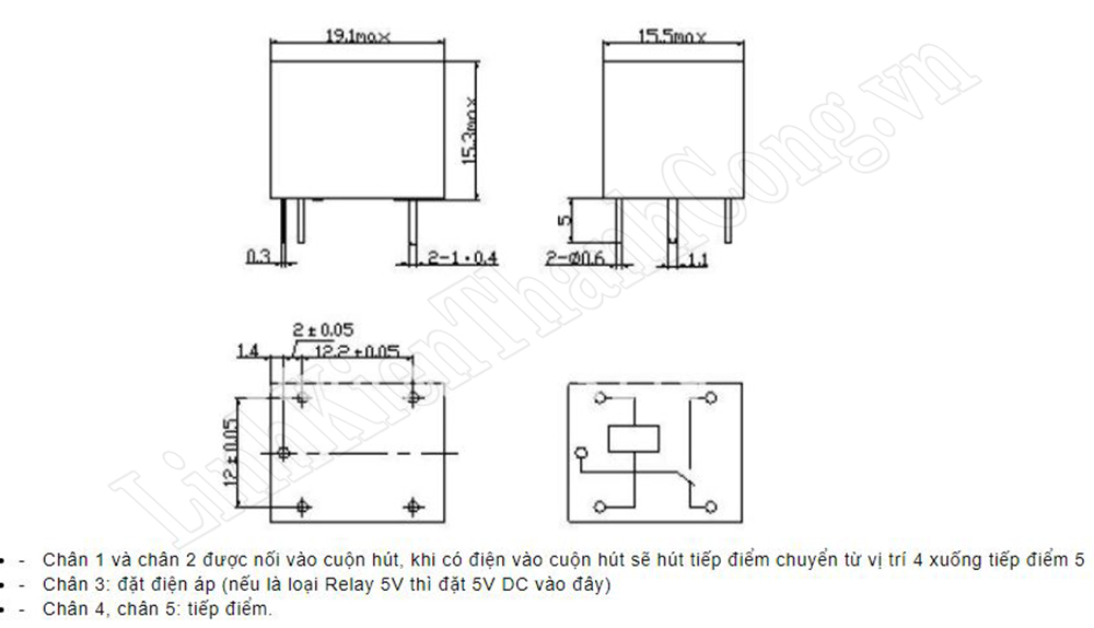 - Phân loại: Relay cơ (Đóng ngắt bằng việc tiếp xúc giữa các tiếp điểm)