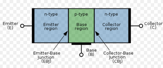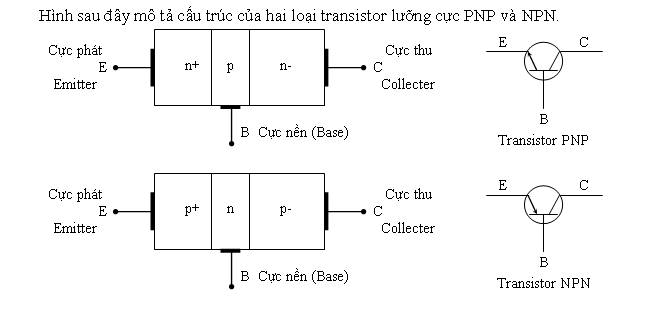 - Transitor hay còn gọi là bóng dẫn gồm ba lớp bán dẫn ghép với nhau hình thành hai mối tiếp giáp P-N , nếu ghép theo thứ tự PNP ta được Transistor thuận , nếu ghép theo thứ tự NPN ta được Transistor ngược. về phương diện cấu tạo Transistor tương đương với hai Diode đấu ngược chiều nhau. Cấu trúc này được gọi là Bipolar Junction Transitor (BJT) vì dòng điện chạy trong cấu trúc này bao gồm cả hai loại điện tích âm và dương (Bipolar nghĩa là hai cực tính)