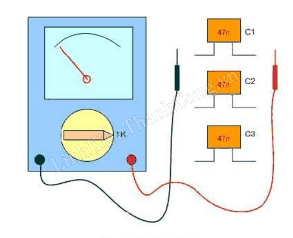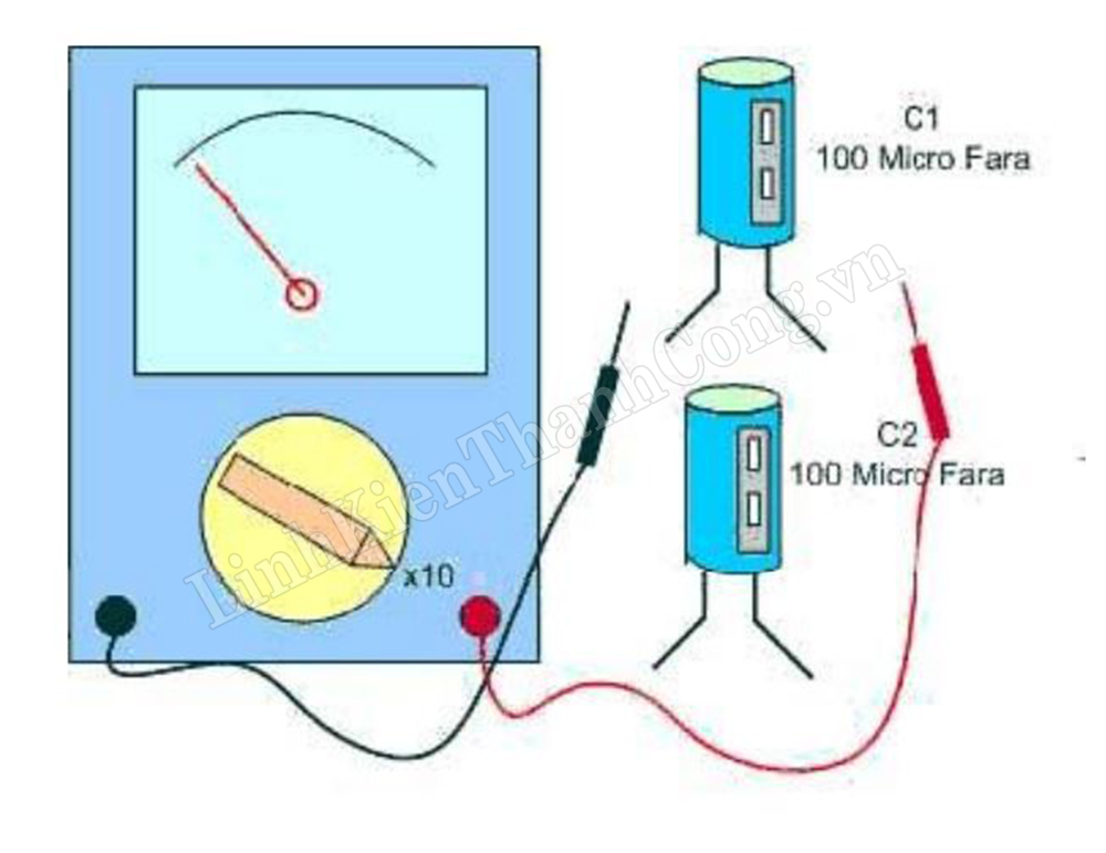 + Để đồng hồ ở thang từ x1Ω đến x100Ω (Điện dung càng lớn thì để thang càng thấp)