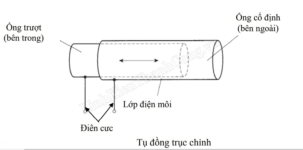 3. Tụ đồng trục chỉnh: là dòng tụ đồng trục gồm 2 ống hình trụ kim loại được bọc lớp nhựa lồng vào nhau. Lớp nhựa đóng vai trò là lớp điện môi. Ống ngoài cố định đóng vai trò là bản cực tĩnh, ống bên trong có thể trượt đóng vai trò là bản cực động, do đó diện tích hiệu dụng giữa 2 bản cực có thể thay đổi điện dung của tụ. Giá trị điện dung (C = n.pF – 100pF), và được ứng dụng trong mạch cao tần.