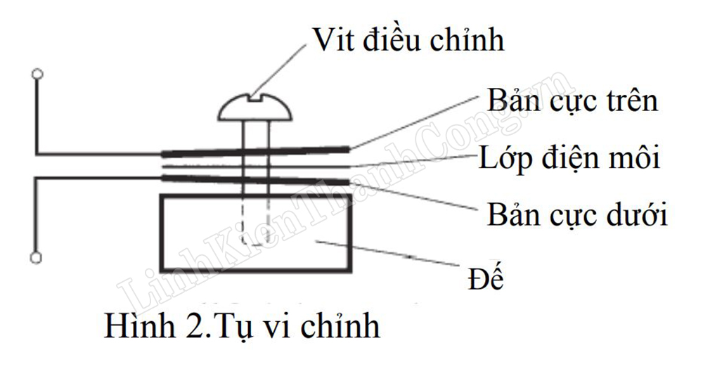 2. Tụ vi chỉnh (Trimmer): kahsc với tụ xoay là điều chỉnh diện tích hiệu dụng giữa các bản cực, tụ vi chỉnh có thể thay đổi giá trị bằng cách thay đổi khoảng cách giữa các bản cực. Tụ có cấu tạo gồm các lá kim loại đặt xen kẽ với nhau, ở giữa là lớp điện môi, khoảng cách giữa các bản cực của tụ thay đổi nhờ ốc vít điều chỉnh được.