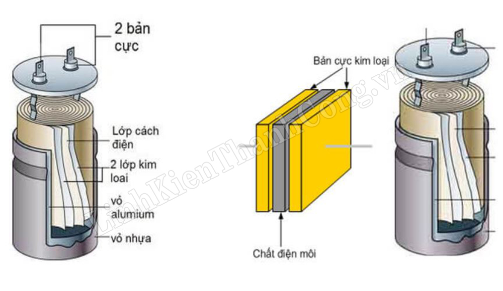 5. Tụ điện phân (Electrolytic Capacitors): còn được gọi là tụ oxi hóa hay tụ hóa. Đây là loại tụ phân cực, gồm các lá nhôm được cách ly bởi dung dịch điện phân và được cuộn lại thành dạng hình trụ. Khi đặt điện áp một chiều lên hai bản cực của tụ điện, xuất hiện màng oxit kim loại cách điện đóng vai trò lớp điện môi. Tụ điện phân có điện dung lớn, lớp màng oxit kim loại càng mỏng thì giá trị điện dung càng lớn (0.1uF – n.1000uF), điện áp đánh thủng thấp (khoảng vài trăm Volt), hoạt động trong dải âm tần, dung sai lớn, kích thước dao động từ nhỏ tới lớn, giá thành tương đối thấp.