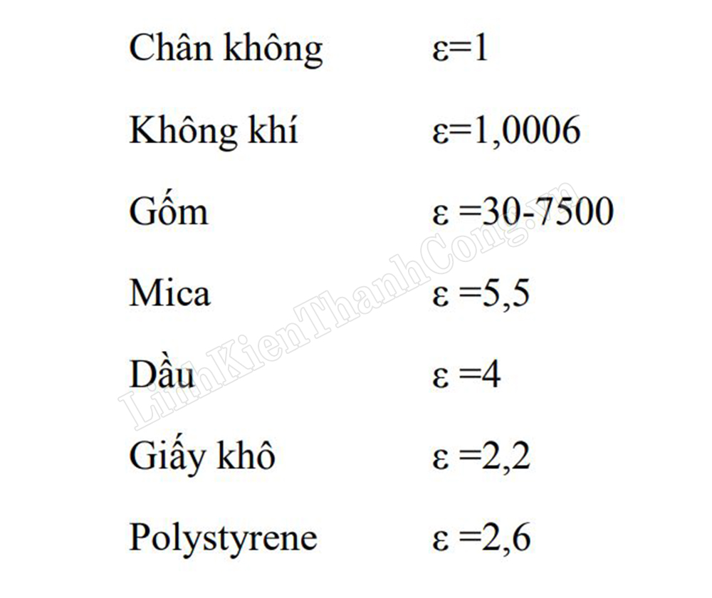 + e: Hằng số điện môi của lớp cách điện (Mỗi một lớp cách điện sẽ có một hằng số điện môi riêng biệt và hằng số này phụ thuộc vào rất nhiều yếu tố: Nhiệt độ, áp suất, chất liệu…).