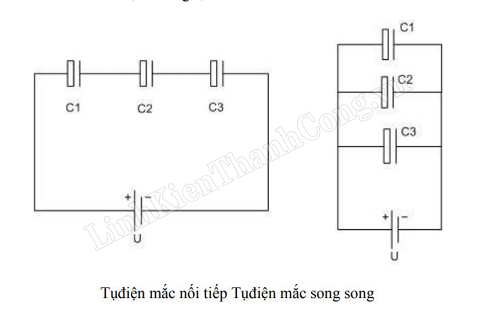 - Khi mắc nối tiếp thì điện áp chịu đựng của tụ tương đương bằng tổng điện áp của các tụ cộng lại. U (tđ) = U1 + U2 + U3