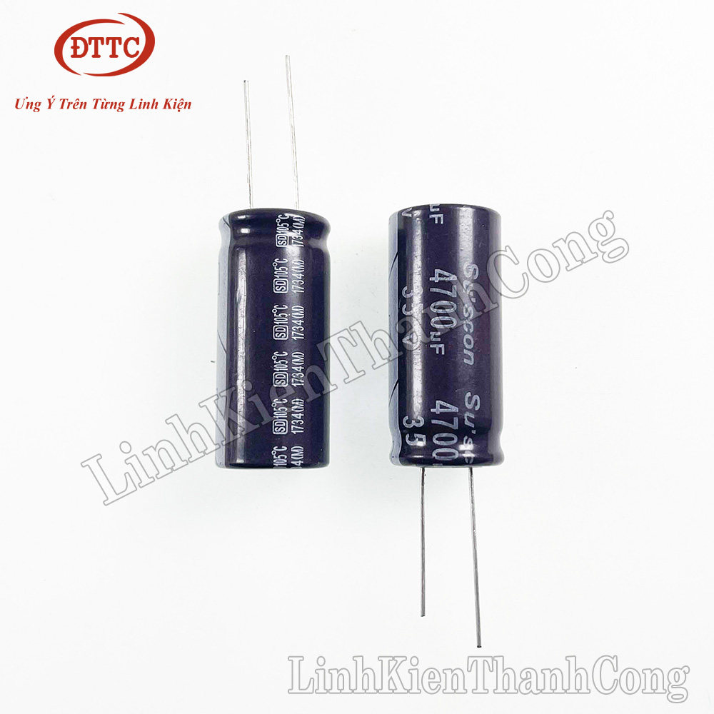 - Tụ Hóa SU'SCON 4700µF 35V là loại tụ điện phân nhôm (Electrolytic Capacitor) chuyên dùng trong các mạch nguồn DC, ampli, bo mạch công suất, thiết bị âm thanh, và nguồn tổ ong. Với điện dung lớn 4700µF, tụ giúp lọc nhiễu, ổn định điện áp, và giảm gợn sóng (ripple) hiệu quả cho các mạch nguồn sử dụng điện áp 12V – 24V – 32V.